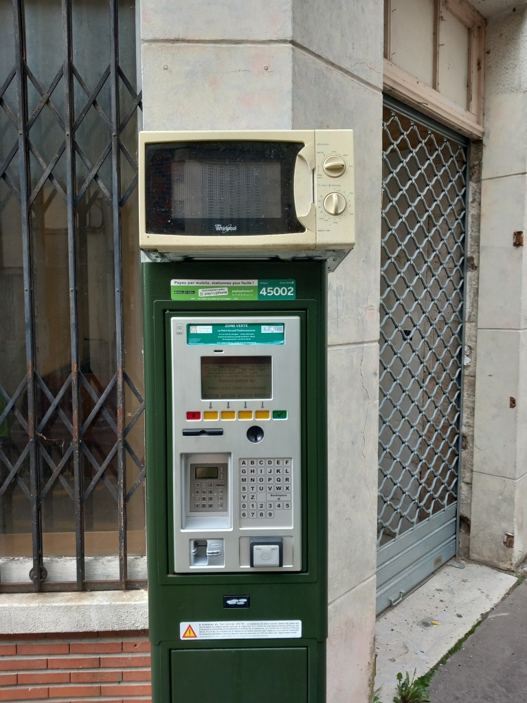 Quand tu vois ça dans ta rue, tu te dis : « Celui qui a pensé ça est un génie ». Parce que quand tu mets ta pièce dans le parcmètre, que tu entres ta plaque d’immatriculation, que tu te trompes de boutons, que tu es obligé de recommencer, parce qu’il fallait mettre la pièce avant… Forcément, à un moment, l’utilisateur lambda se dit : « je me réchaufferais bien un petit café ». Je pourrais avoir un mug avec moi et me faire un petit lyophilisé, des nouilles ou une soupe en sachet. Ce serait quand même beaucoup plus convivial, ce qui inciterait au paiement. Alors que les gens, sans ce service et ce sens de l’hospitalité, ce supplément d’âme, qu’est-ce qu’ils font ? Ils ne prennent pas de ticket. Ils se disent, si je me fais prendre une fois sur dix, ça coûte moins cher que prendre un ticket à chaque fois. En plus, il y a un côté loterie, sans mise de départ, les gens sont joueurs. Ils se disent, je vais tester mon karma. C’est sûr, il y a un gros marché pour ce concept de four micro-onde combiné parcmètre. C’est l’avenir. Depuis, il a été posé par terre à côté, c’est beaucoup moins esthétique. Sûrement un problème de branchement.