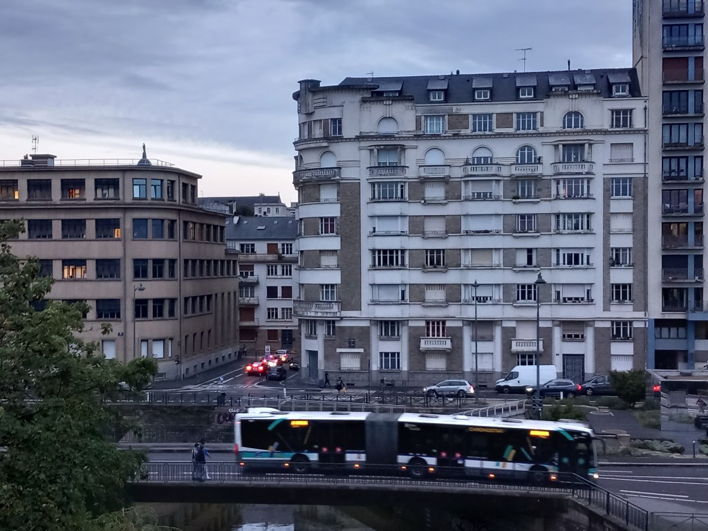 Par chance, l’hôtel des chouettes propose une chambre avec balcon, un véritable nid d’aigle, d’où j’ai pu observer les quais au petit matin. Une vue plongeante sur la Vilaine et le quai de Richemont, qui est un pont sans nom à cet endroit, juste avant l’avenue du Sergent Maginot, là où commence le site propre central du bus, au niveau de ce qui se nomme assez explicitement le Miroir Carré. Au-dessus du front bâti, trône la vierge de Saint Melaine, laissant imaginer le parc du Thabor non loin. Désormais, les riverains de l’axe bénéficient d’un niveau acoustique parfaitement acceptable, ce que j’ai pu constater fenêtre ouverte. De visu, sans avoir pris le temps de compter : énormément de vélos et de piétons, beaucoup mais vraiment beaucoup de bus (Le STAR : combien de rotations cumulées toutes lignes et tous sens confondus un jour ouvrable de base ?) et quelques voitures. En fait, il ne reste vraiment plus grand-chose à enlever ici.