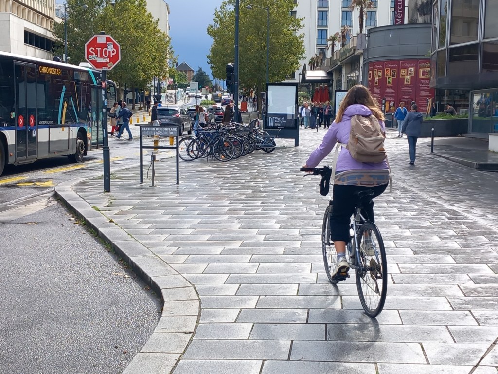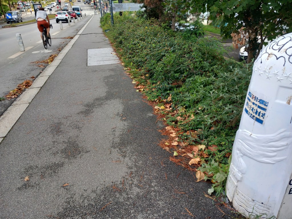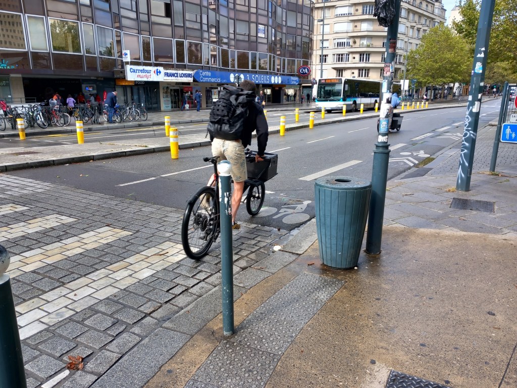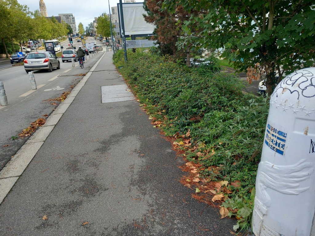 Il faut dire qu’ici, c’est un défilé permanent, j’ai hâte de connaître le score, Gildas ! Car il y a un détail qui a son importance, que seuls les piétons et les cyclistes pas trop rapides peuvent voir : ici, c’est la voie de la liberté. Une mystérieuse borne blanche (qui fait aussi office de borne routière) le rappelle, la ville a été libérée par ici en 1944. Objectif : qu’en 2024 cette pauvre et triste bande cyclable soit colorée à la hauteur de sa portée symbolique. Une inscription colorée « VOIE DE LA LIBERTE » sur le sol (PALM, inkOj ou d’autres vous feront ça très bien). Rouler sur la voie de la liberté et non sur la file des véhicules qui polluent l’atmosphère et oblitèrent l’avenir.