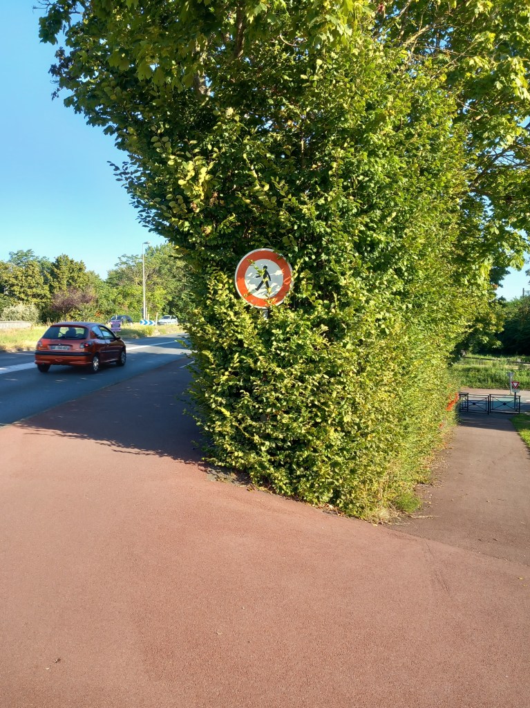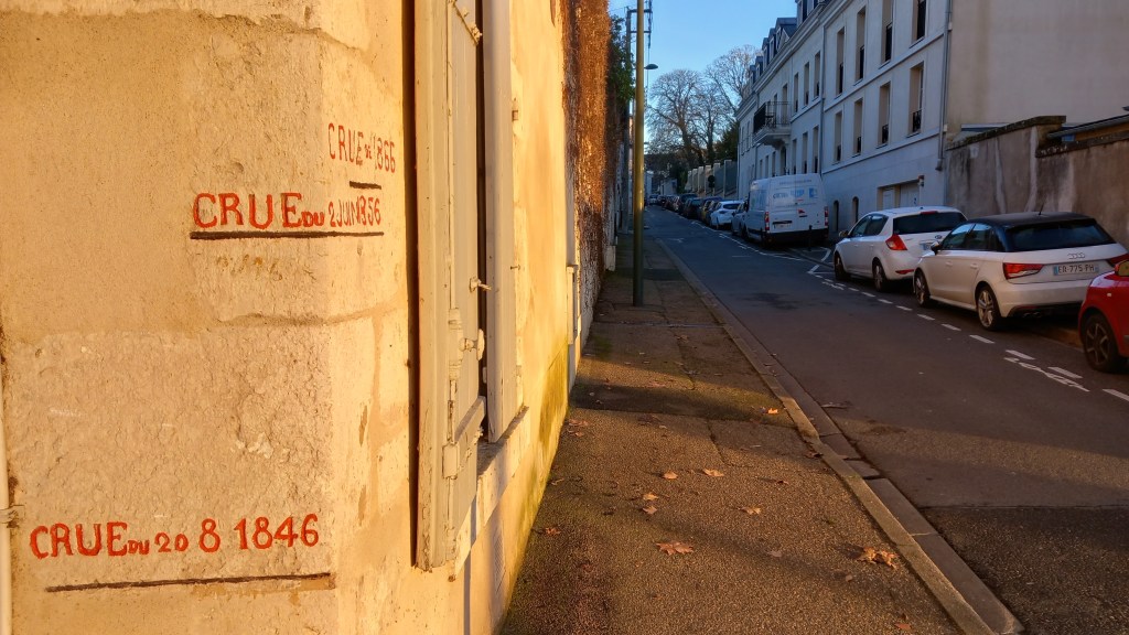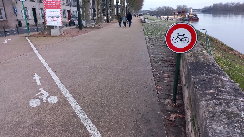 Sur street view, google, nous permet de voir l’empilement des pictos, panneaux, lignes. A l’est, le panneau « interdit aux vélos » apparaît en 2022, la ligne blanche en 2019, des pictos supplémentaires sont ajoutés en 2016, alors que les chevrons verts étaient présents dès septembre 2009. Au départ, ils ne font que suggérer un semblant d’itinéraire, qui s’est renforcé ensuite, jusqu’à l’interdiction du vélo du mauvais côté de la ligne, celui avec vue sur Loire. A l’ouest, la ligne de démarcation est tracée en 2019 par contre le panneau interdiction est posé en 2020. Donc pendant deux ans, on pouvait contrevenir en venant de l’Est, sans avoir l’information. Un classique sur les quais (au fait, le panneau 30 est toujours manquant à l’appel sur le quai du roi).