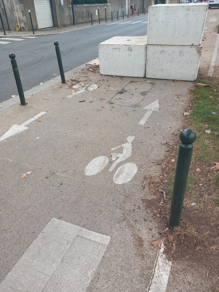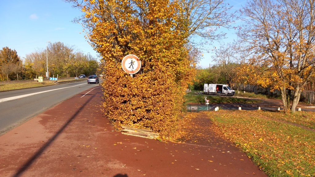 Pour moi, la Zone Innovante de la route de Sandillon est une œuvre choc. Elle montre par l’absurde l’aberration qu’il y aurait à dessiner des pistes cyclables sur les trottoirs. On imagine les piétons qui peuvent à peine sortir un pied entier de chez eux. L’axe est aligné avec une vue sur la Cathédrale qui le toise. Montrant ainsi le caractère petit, éphémère et forcément dérisoire en comparaison. Pour terminer l’axe au Nord, l’aménagement s’arrête net avec un écriteau qui proclame sans ambiguïté : Cyclistes à Pied ! Quelques mètres avant cela, le cycliste filait depuis un bon kilomètre sur un linéaire qui avait évincé le piéton du trottoir et là il se retrouve de nouveau dans un domaine qui n’est pas le sien. Sur ce trottoir, on le tolère, à la seule condition qu’il se déplace à pied ! Retour au code de la route. Tout s’inverse si soudainement ! (NDR : un accident survenu le 03/01/24 est venu me rappeler qu’il fallait finir ce billet)