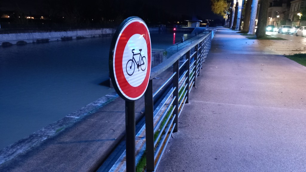 En poursuivant vers la Loire, après le passage sous la voie ferrée, le cycliste retrouvera la plus vieille autoroute à vélo que je connaisse (elle daterait de 1989, 2010 pour l’open data ah ah !). Puis il s’engagera sur le pont Thinat et il tiendra sa vengeance avec un panneau « interdit aux piétons ». En effet, ici se trouve un haut lieu de la rivalité entre piétons et cyclistes (et d’hilarité pour ceux qui s’en fichent au plus haut point) : selon une légende locale (à laquelle participe le panneau susmentionné) seuls les cyclistes peuvent emprunter le pont Thinat (avec les voitures) et les piétons doivent marcher sur le pont de Vierzon (avec les trains). En vérité, quand on vient du Nord, on n’a, à aucun moment, cette information et chacun fait bien comme il veut, bien que ça dérange ceux qui veulent que les choses soient à leur place, dans leur couloir de nage.