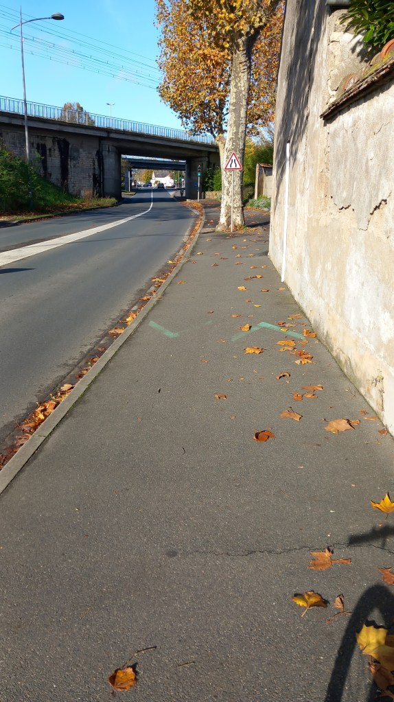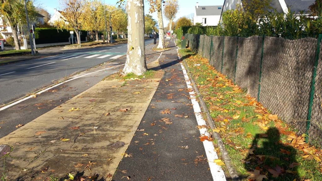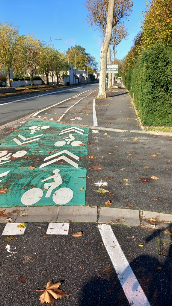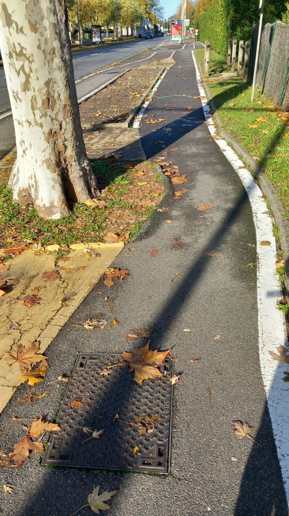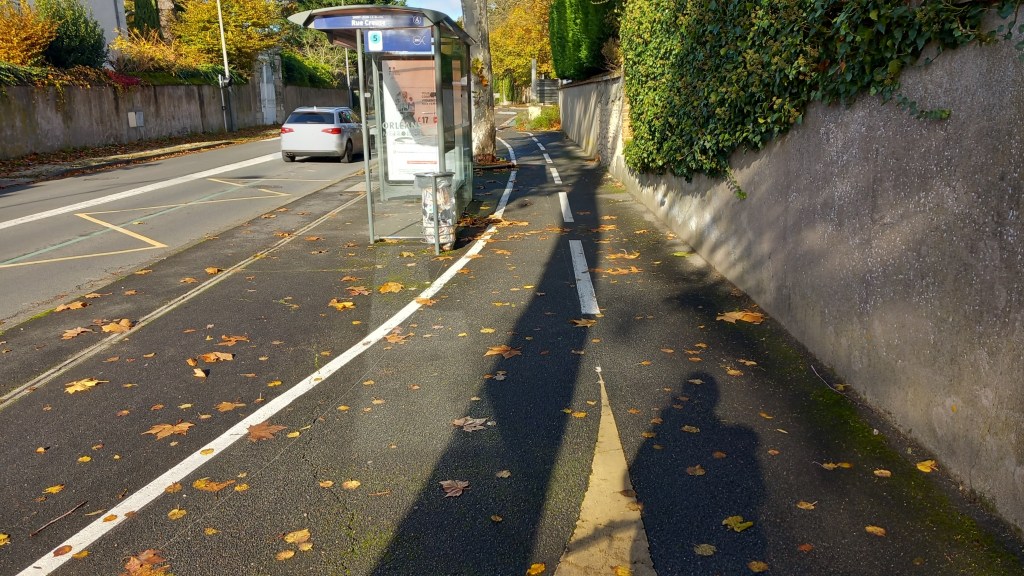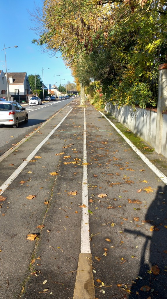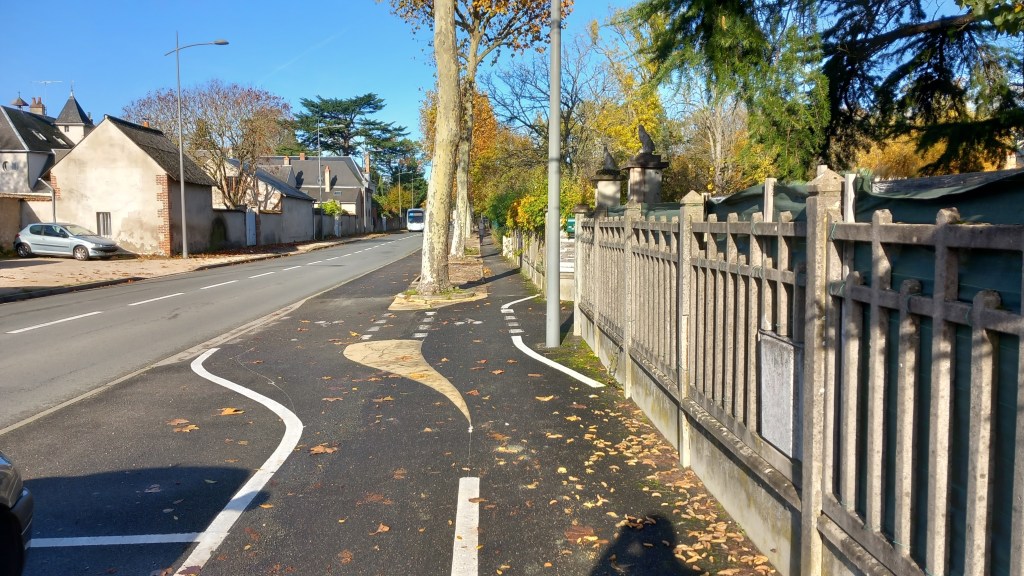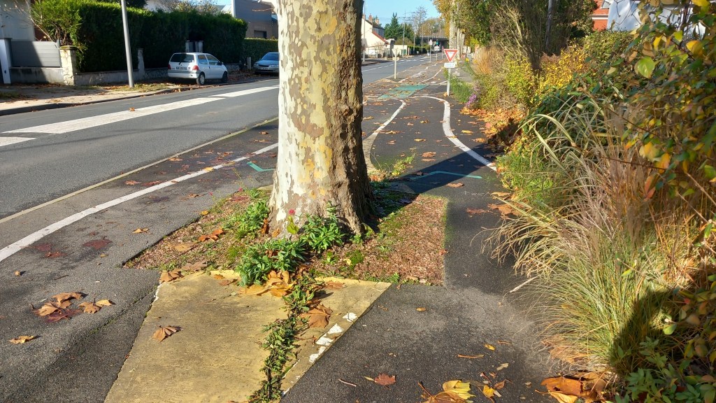 En fait, cela faisait des années qu’il n’avait pas emprunté cette installation prodigieuse. En effet, il serait réducteur de qualifier de simple « aménagement » les trésors d’imagination déployés ici par le peintre qui n’a hélas pas signé cette œuvre (antérieure à mon arrivée à Orléans en 2012, elle daterait de 2010 à en croire l’open data , toutefois street view la voit déjà en octobre 2009 ). Dans la poésie des courbes, le street artiste local a eu l’audace de dessiner un serpentin astucieux qui slalome et virevolte entre les platanes, les arrêts de bus, les poubelles (et même à l’époque une cabine téléphonique qui a été enlevée depuis, on trouve aussi des vestiges d’arbres morts.) On sent qu’il s’est fait plaisir, comme lorsque mes enfants installaient leur circuit tortueux en plastique. Une ribambelle de photos pour que viviez ce trajet retour (le soleil étant dans mon dos, par cette belle matinée du 17/11/23)