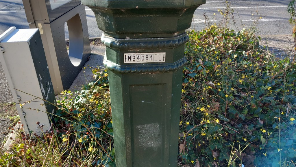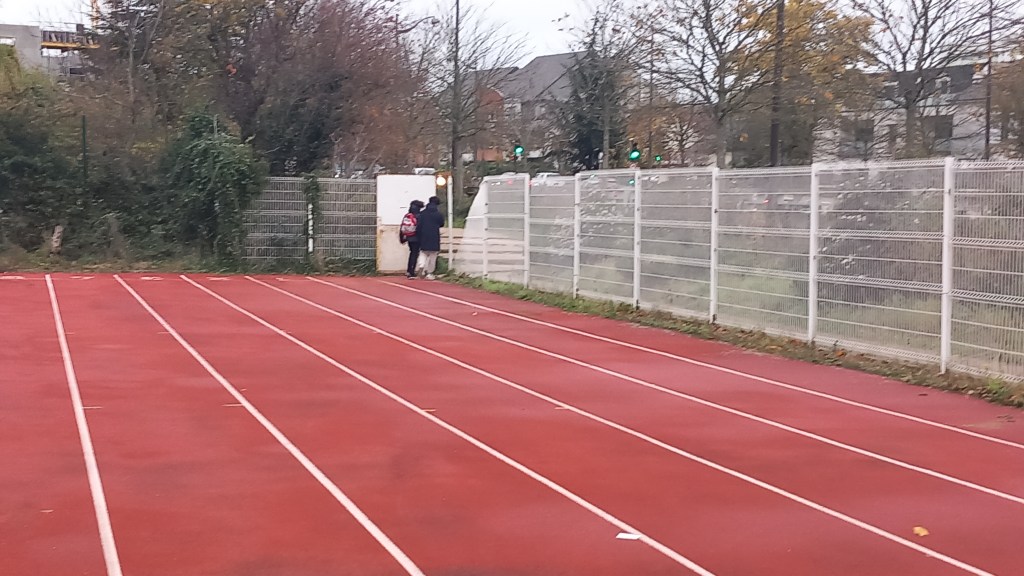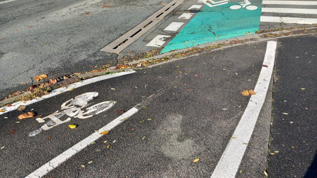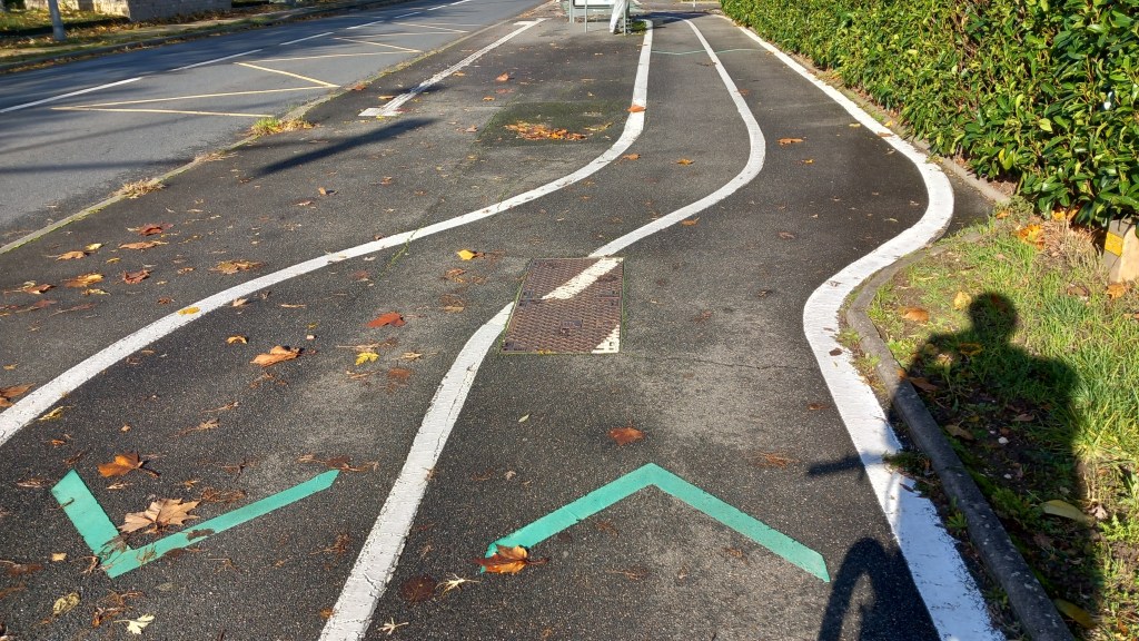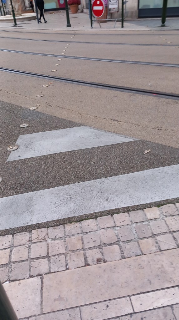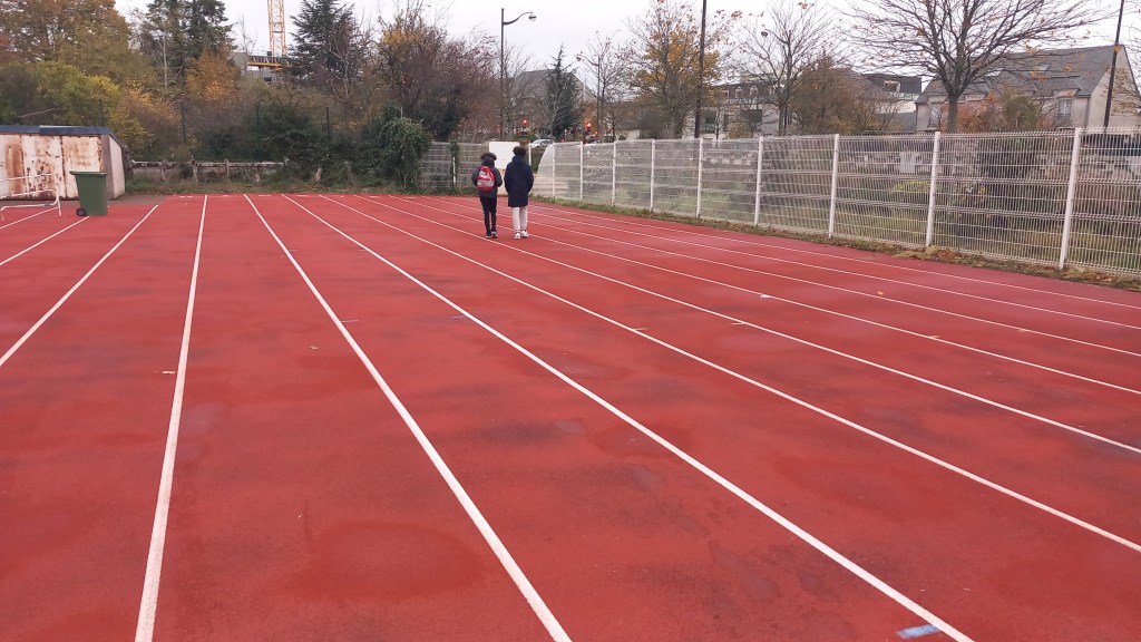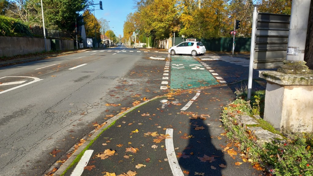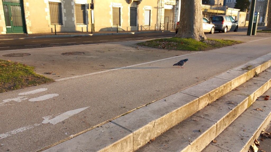 En fait, cela faisait des années qu’il n’avait pas emprunté cette installation prodigieuse. En effet, il serait réducteur de qualifier de simple « aménagement » les trésors d’imagination déployés ici par le peintre qui n’a hélas pas signé cette œuvre (antérieure à mon arrivée à Orléans en 2012, elle daterait de 2010 à en croire l’open data , toutefois street view la voit déjà en octobre 2009 ). Dans la poésie des courbes, le street artiste local a eu l’audace de dessiner un serpentin astucieux qui slalome et virevolte entre les platanes, les arrêts de bus, les poubelles (et même à l’époque une cabine téléphonique qui a été enlevée depuis, on trouve aussi des vestiges d’arbres morts.) On sent qu’il s’est fait plaisir, comme lorsque mes enfants installaient leur circuit tortueux en plastique. Une ribambelle de photos pour que viviez ce trajet retour (le soleil étant dans mon dos, par cette belle matinée du 17/11/23)