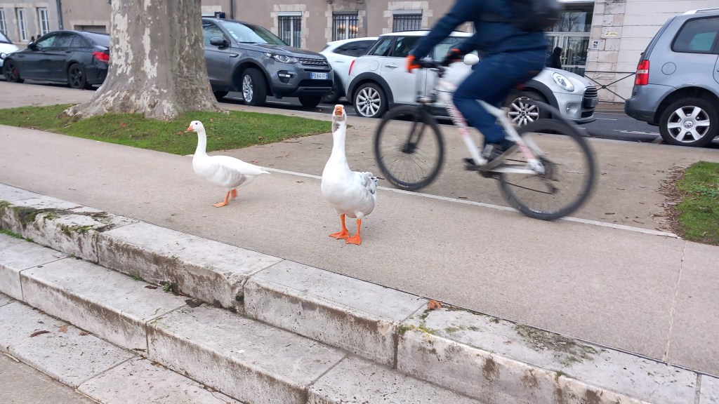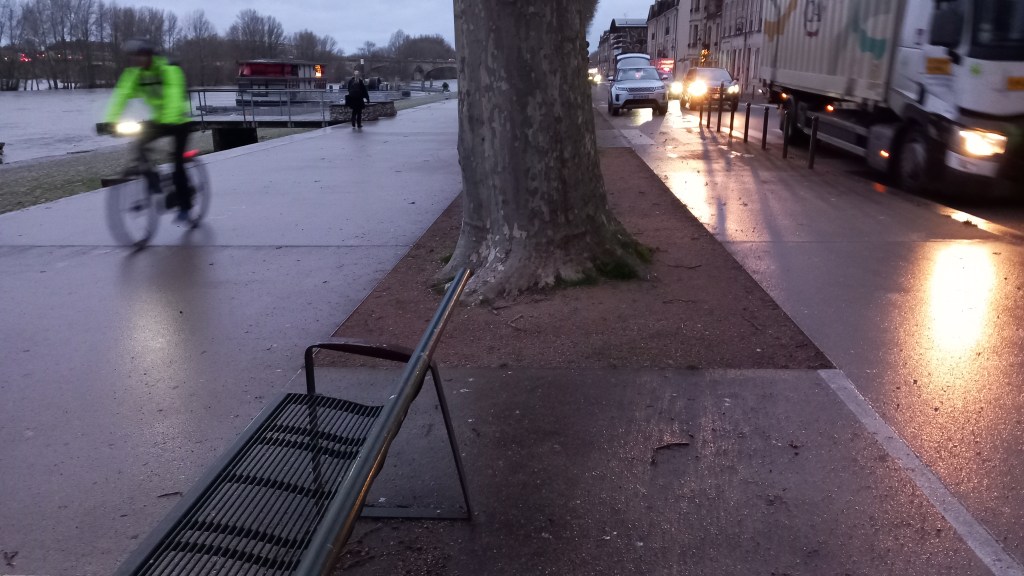 Une fois franchit la Loire, on a envie de discuter de l’aménagement du quai de Loire au nord. Le pont Thinat aura peut-être son billet à lui, un jour (j’ai un début de dossier sur lui). Un jour, un homme, et pas n’importe lequel : Michel Corajoud , a retiré le parking sur les quais bas et a dessiné un bel aménagement ouvert sur les quais hauts, en maintenant une chaussée avec une voie par sens. La décrue automobile fut saisissante (je réitère mon lien vers la page 31 du bilan du PDU de 2015). A tel point que les années passants, une multitude de cyclistes et autres trottinettistes se sont mêlés aux piétons, poussettes et fauteuils roulants. A tel point que certains réclamèrent une piste cyclable bien délimitée. Alors un beau jour de 2019, ou plutôt un triste jour de mon point de vue, l’espace mixte dessiné par le grand paysagiste fut divisé par un trait de peinture blanche. Une multitude de pictogrammes et quelques panneaux vinrent compléter cette ligne de démarcation, une sorte de mini-mur de Berlin. Depuis, les cyclistes peuvent rouler vite (mais attention aux passages piétons) et cyclistes comme piétons peuvent maugréer contre ceux qui ne sont pas à leur place. Souvent, j’aime rouler en vélo sur l’espace piéton, avec mes enfants (la piste est trop dangereuse et proche des pots d’échappement pour leurs petits poumons) ou seul pour contempler la Loire, les hérons et les oies. Lorsqu’il fait trop chaud l’été, je profite de l’ombre des platanes et marche sur la piste cyclable l’après-midi. Sur un autre itinéraire, quand j’accompagne mon fils au sport, on marche sur la piste cyclable pour être plus proche de la voie ferrée que le long du volumineux flux saccadé des voitures. On le fait pour nos poumons, pas contre les cyclistes.