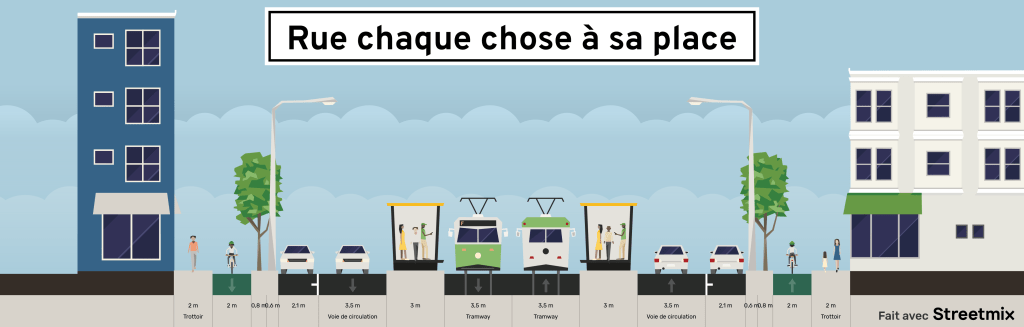 En général, à ce stade de la discussion, quelqu’un propose qu’on lui porte un crayon bien taillé qui fera office d’opinel, pour découper au cordeau une part respectable pour chacun. Cela conduit à concevoir des espaces publics saucissonnés qui dans un plan en travers ressemblent à une piscine olympique ou une piste d’athlétisme : idéalement on y retrouve 4 couloirs : piéton – vélo – voiture –transport en commun, qu’on multiplie par deux, pour permettre le mouvement dans les deux sens. Si on y réfléchit un instant, il faudrait 35 mètres entre deux façades pour permettre ce pluralisme équitable dans la rue. Souvent il n’y en a que 20, dans la mienne, par endroit on peine à en trouver 7.