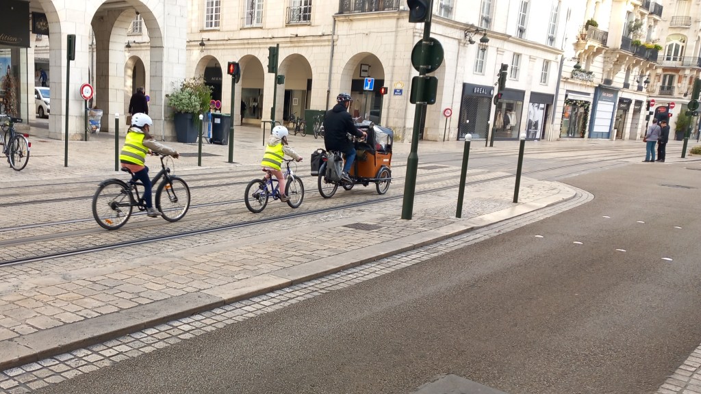 Une dernière remarque, de déMobiliste, c’est dommage de faire rouler un bus ! La sortie à vélo, depuis l’école, possède l’avantage d’explorer en selle un quartier connu, avec sa circulation réelle. Pour les petits du centre, les quartiers résidentiels du Sud Loire, c’est bucolique, mais loin du trafic routier qu’ils connaissent. Amener son vélo à école permet aussi à l’enseignant de voir qui n’en a pas (c’est peut-être eux qu’il faut former davantage). L’ile Charlemagne, c’est idéal pour le vélo loisir et pour l’entraînement en zone sécurisée. L’excursion autour, comme je l’ai montré, est parfaite pour débuter dans la circulation générale. Mais après faudrait passer au niveau hard : rouler avec les bus sur les mails, visiter la plateforme du tram, pédaler dans des rues longées de portières, se positionner dans un sas vélo… tout cela se trouve à quelques tours de pédalier de l’école.