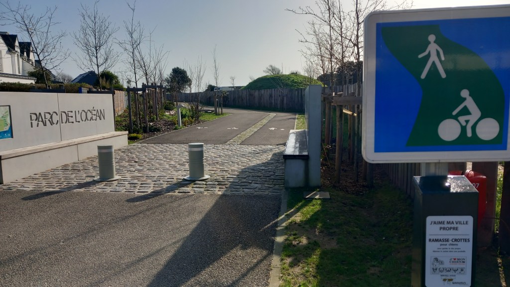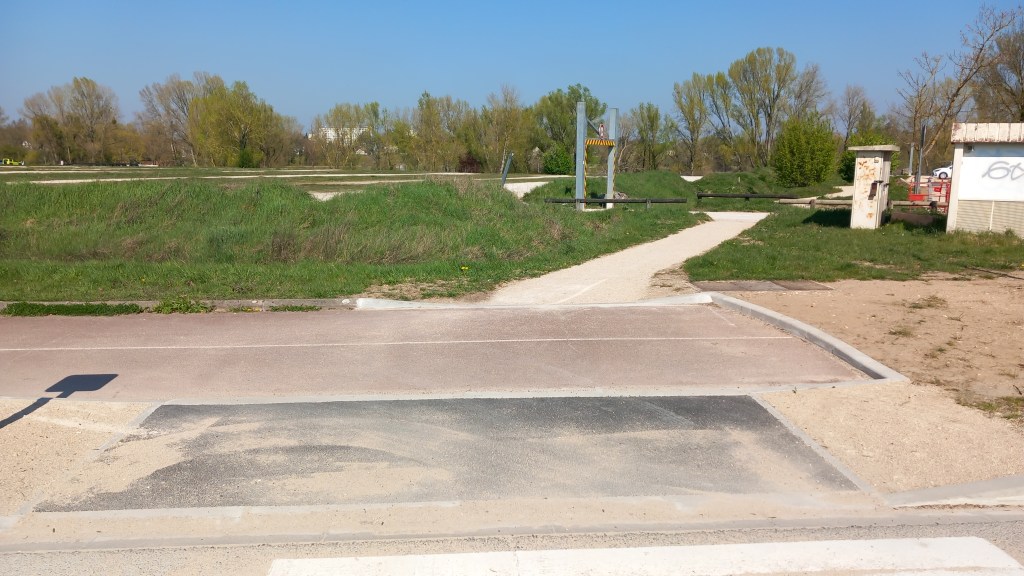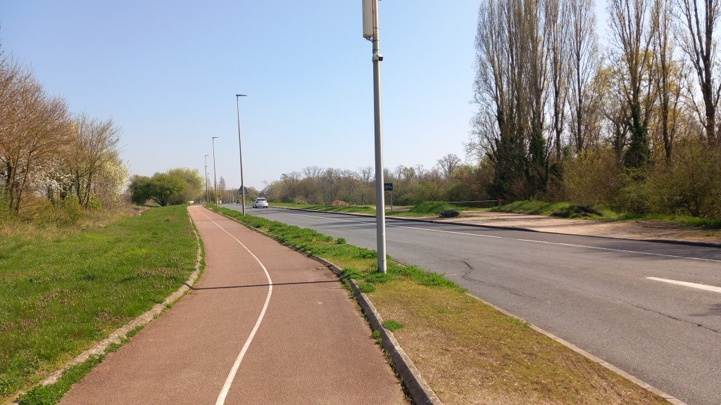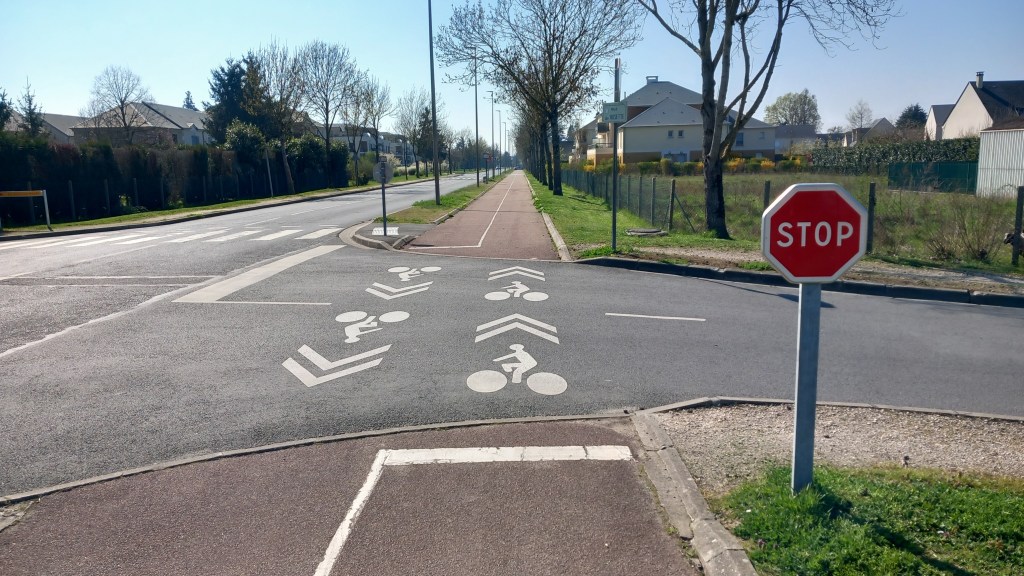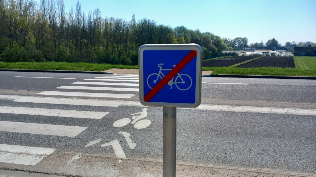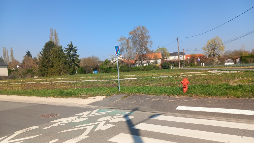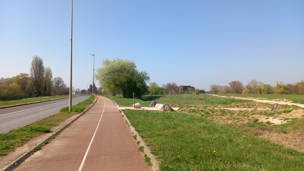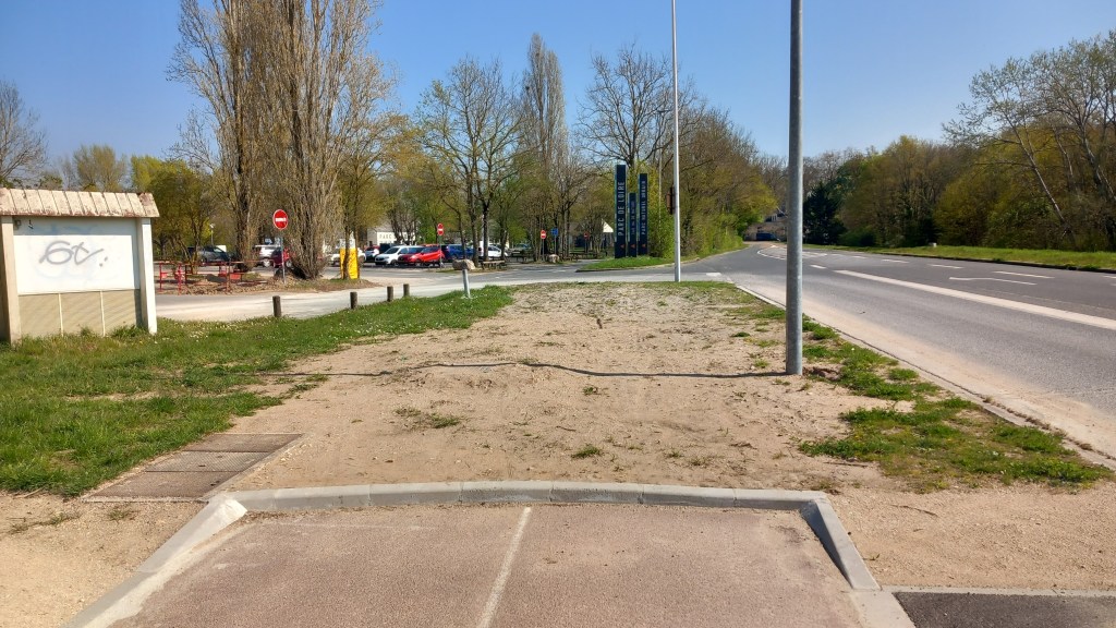 Dès le parking de la base de loisir, la réalité s’affiche dans toute son insolente majesté : nous rejoignons une piste cyclable branchée de manière bien fantaisiste, suite à des travaux récents. Ici, elle s’arrête nette et vous envoie soit dans le parking par la porte de derrière (d’où nous venons) ou sur un passage piéton vers absolument rien (il sert à couper à travers champ ?). C’est une véritable installation artistique pour méditer sur les voies impénétrables de l’urbanisme : pourquoi l’univers urbain est-il ainsi construit ? Pourquoi est-il aussi méchant ?