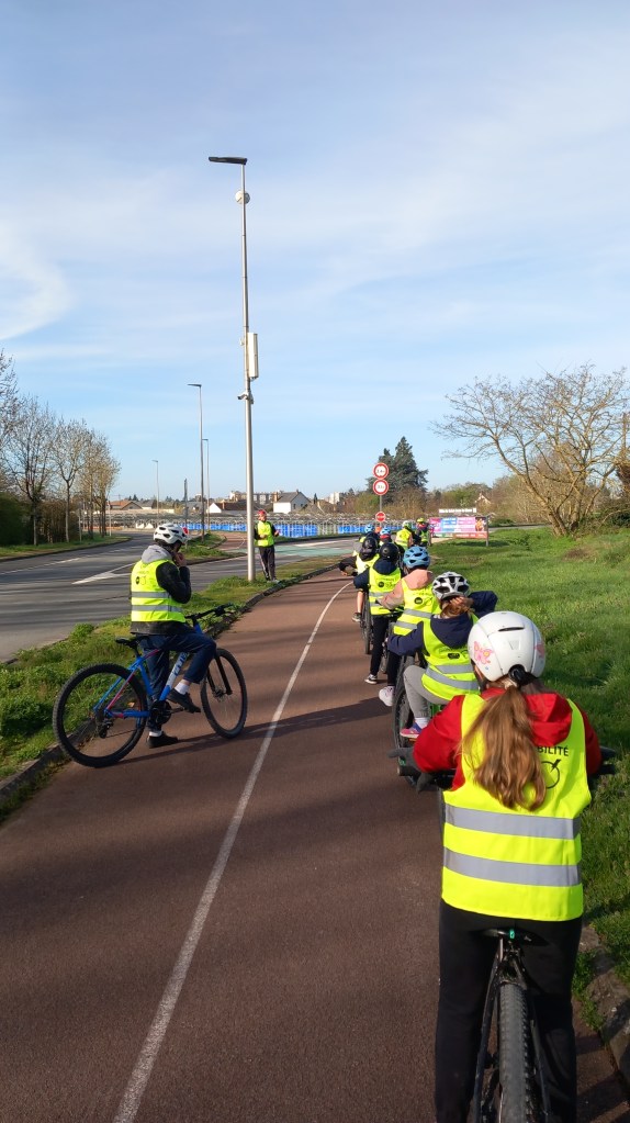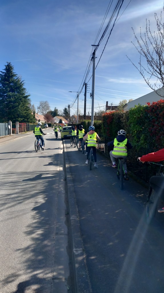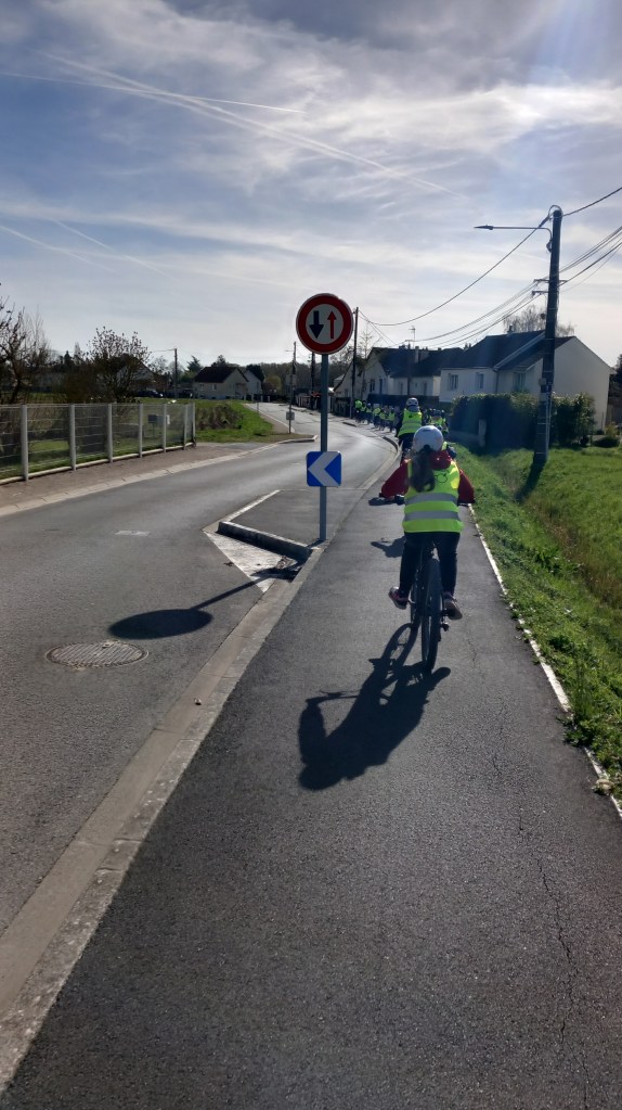 Mon rôle était de celui de vélo-balai, en queue de peloton. J’ai remis en place trois chaînes après leur déraillement, ma technique du bâton pour ne pas se salir les doigts n’a pas vraiment fonctionné. En plus d’assurer la « sécurité », j’ai surtout passer une belle journée à pédaler avec nos enfants, un super groupe. Incorrigible, je n’ai pu m’empêcher de prendre des photos des panneaux, des aménagements, mais aussi des apprentis cyclistes.