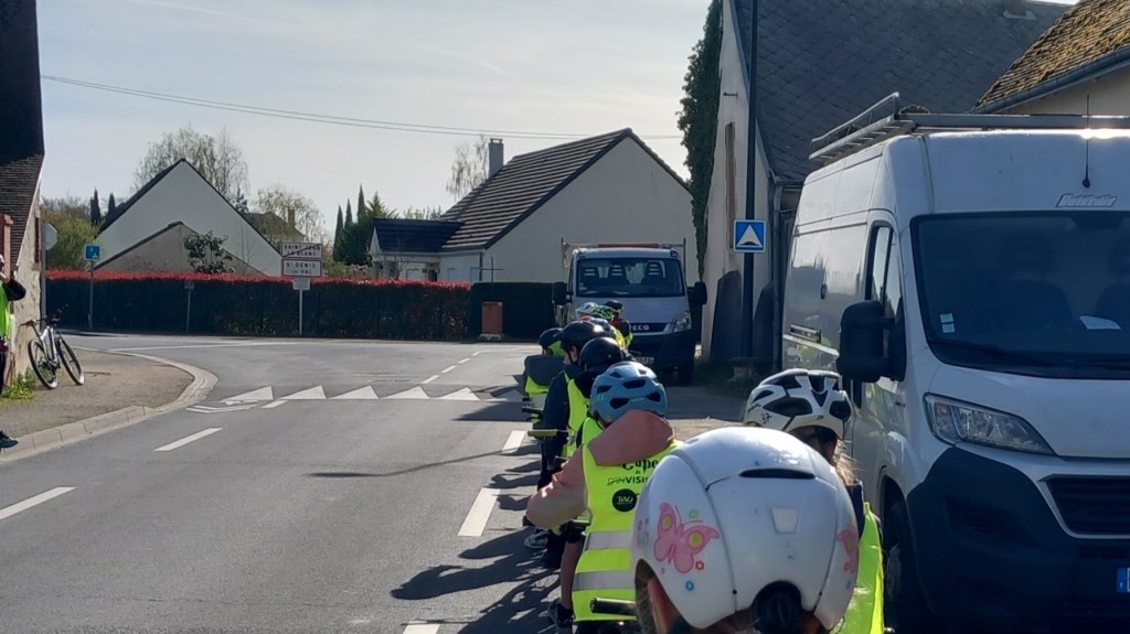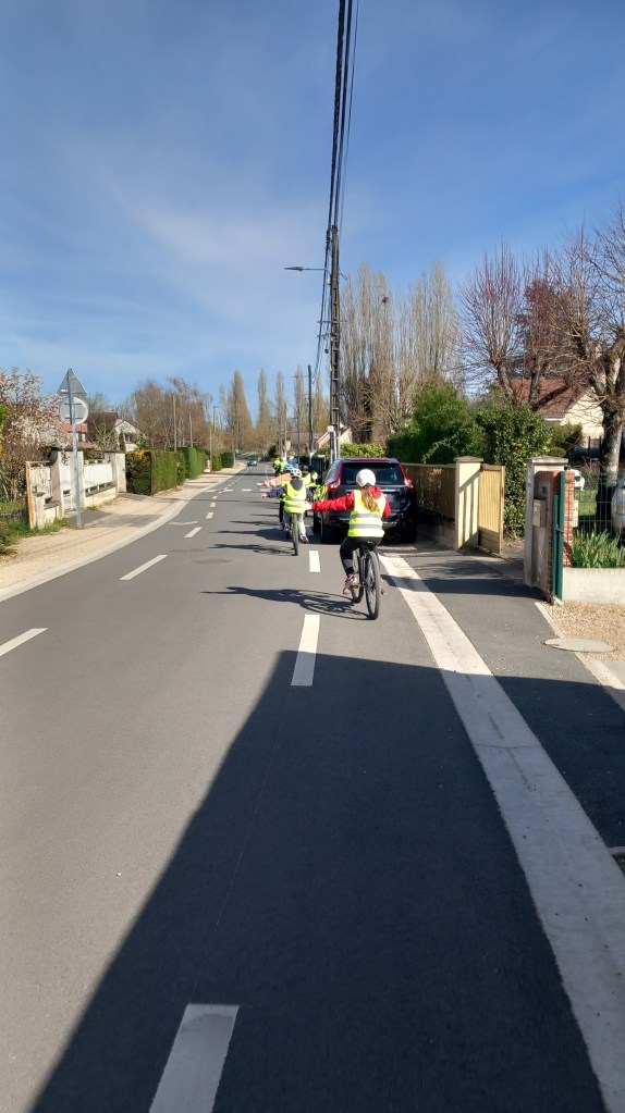 Très vite arrive la première intersection, comme la piste se poursuit sur l’avenue Douffiagues, il faut franchir la chaussée qui continue sur la levée. Le premier stop. Chaque enfant doit s’arrêter, observer pendant trois secondes pour vérifier que la voie est libre à gauche et à droite, puis s’engager. Il doit remonter sa pédale pour être rapide au démarrage. Si une voiture approche, on la laisse passer. Il y a peu de circulation, donc ça va vite. Une voiture de la police municipale cède le passage, on lui demande de ne pas laisser la file entière passer (ça fausse la mise en situation).