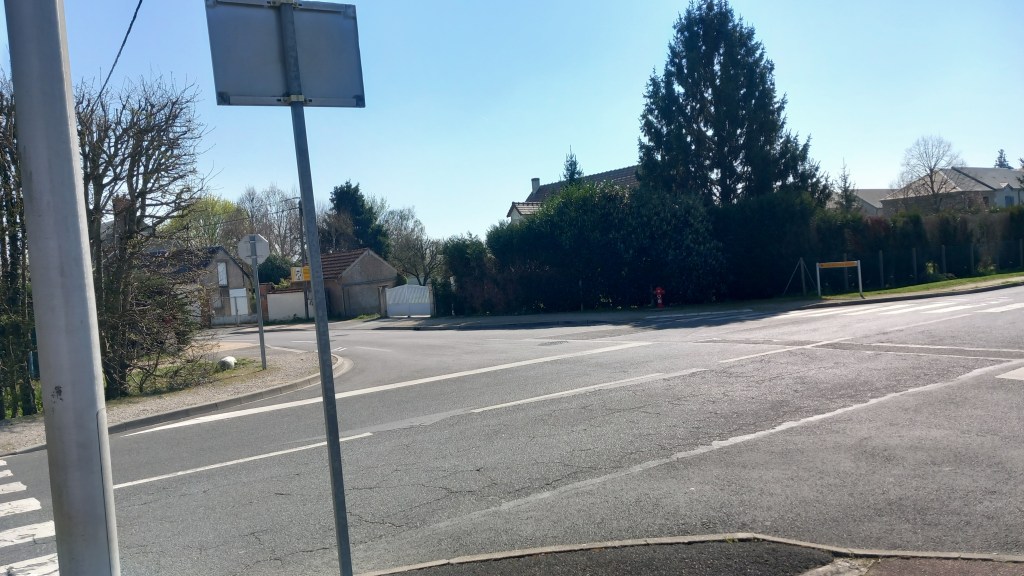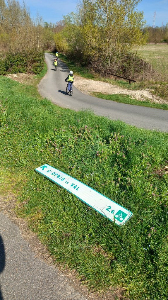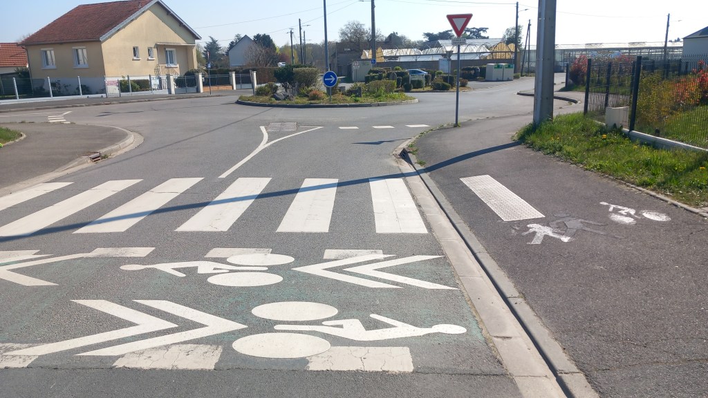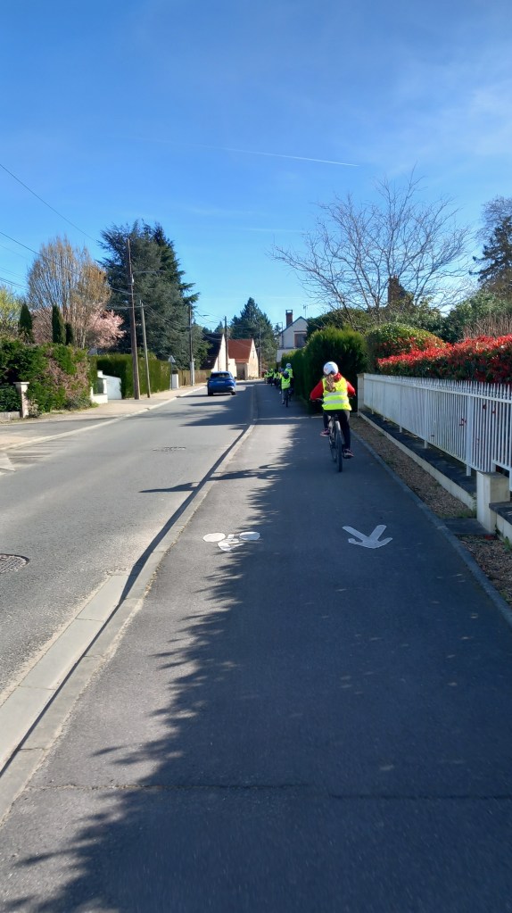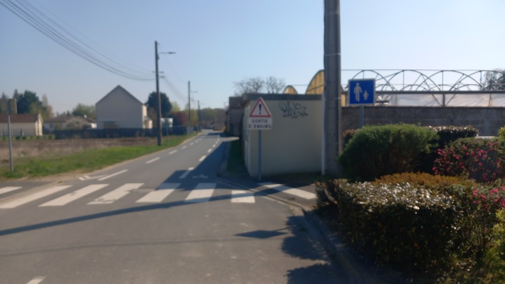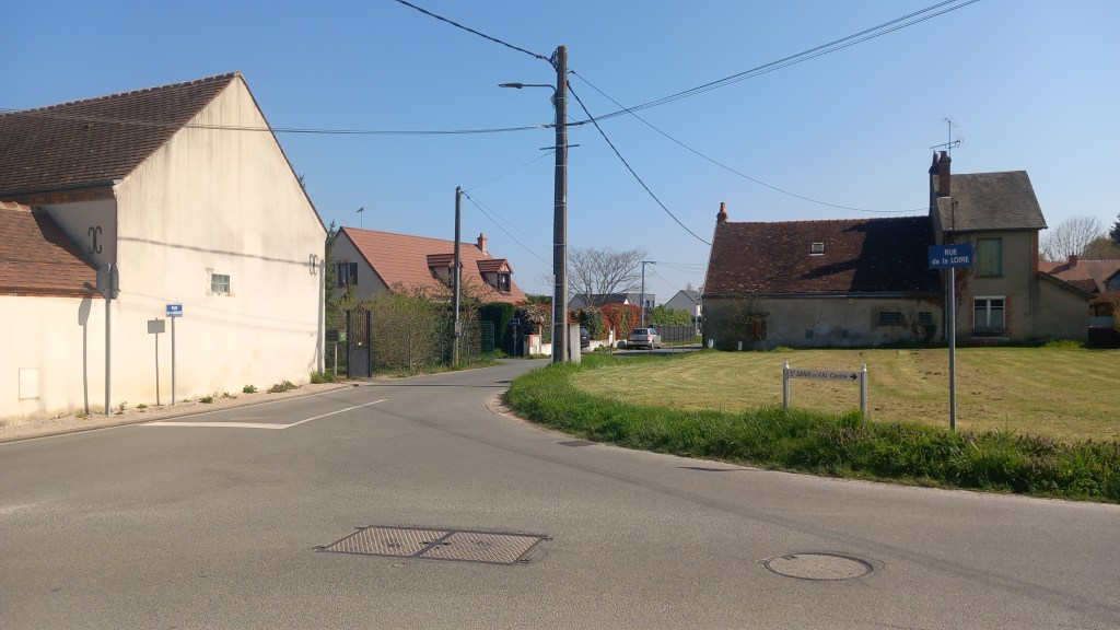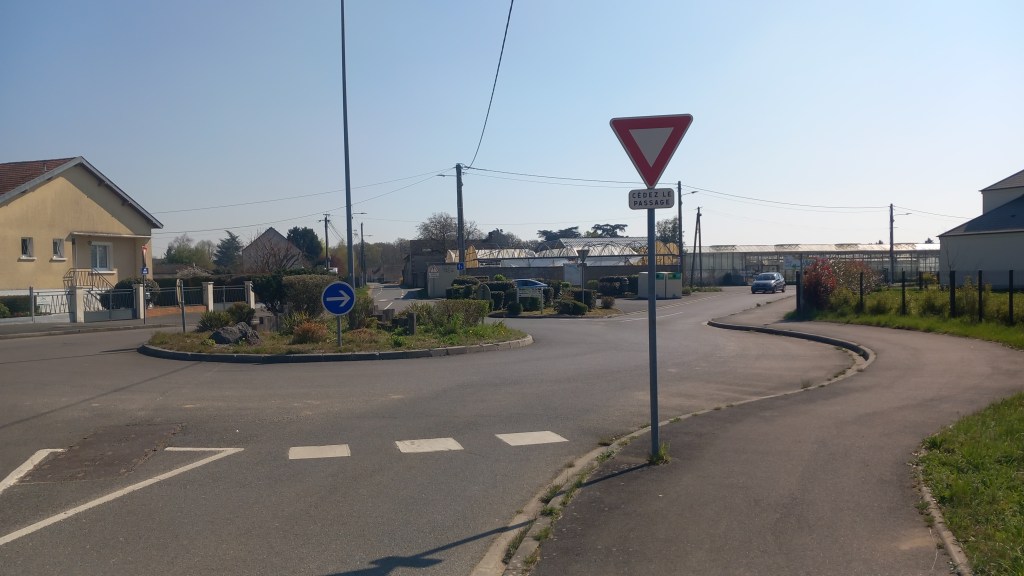 Ensuite, la rue résidentielle devient champêtre et nous approchons d’un petit giratoire (mode facile), nous irons à gauche, vers la rue de la Loire. C’est le moment d’une petite formation sur la prise de giratoire à vélo. Je suis étonné de l’instruction « placez-vous à l’extérieur de l’anneau, tendez le bras gauche quand vous ne sortez pas, le bras droit quand vous sortez ».