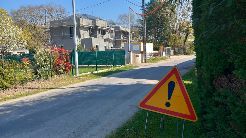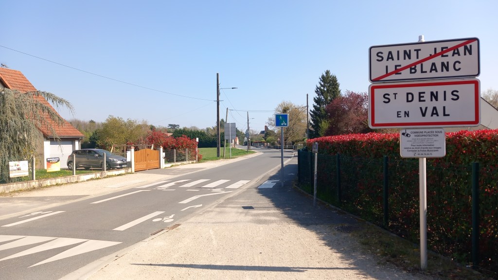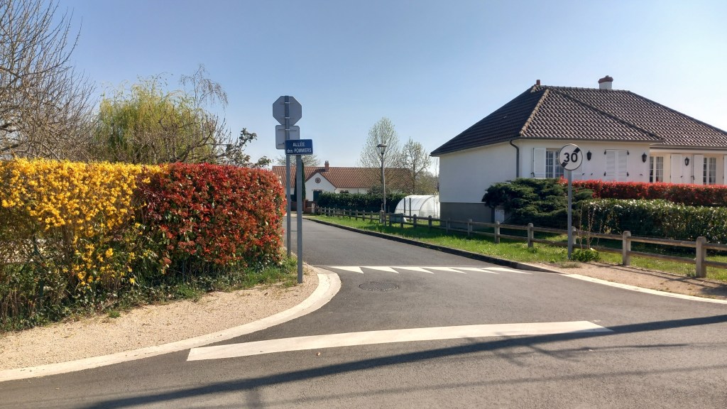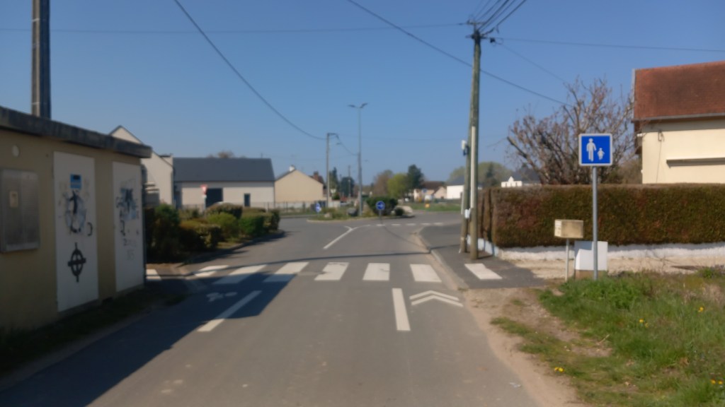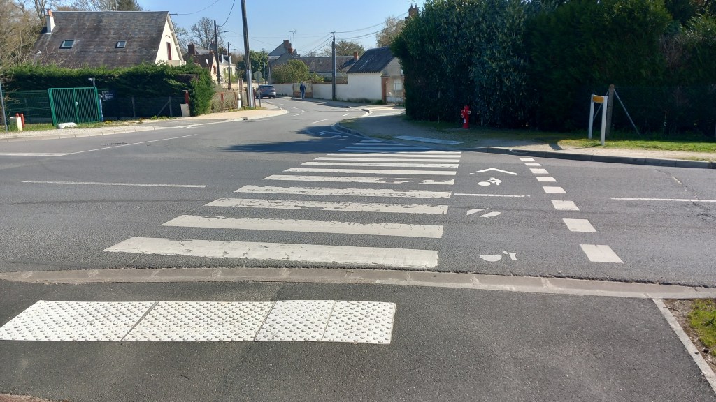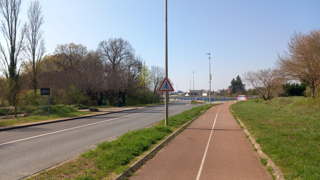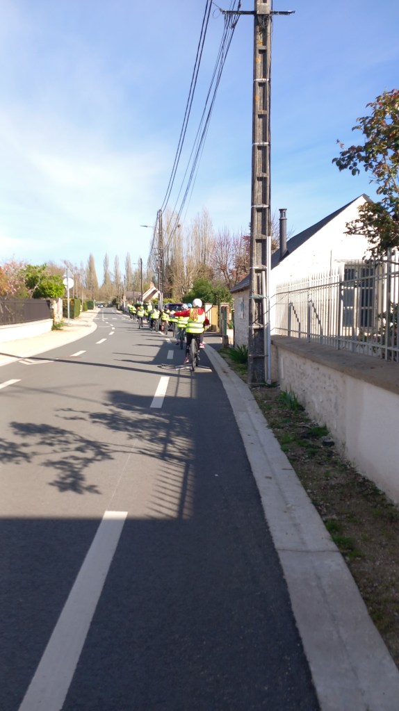 Ensuite, la rue résidentielle devient champêtre et nous approchons d’un petit giratoire (mode facile), nous irons à gauche, vers la rue de la Loire. C’est le moment d’une petite formation sur la prise de giratoire à vélo. Je suis étonné de l’instruction « placez-vous à l’extérieur de l’anneau, tendez le bras gauche quand vous ne sortez pas, le bras droit quand vous sortez ».
