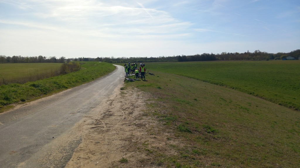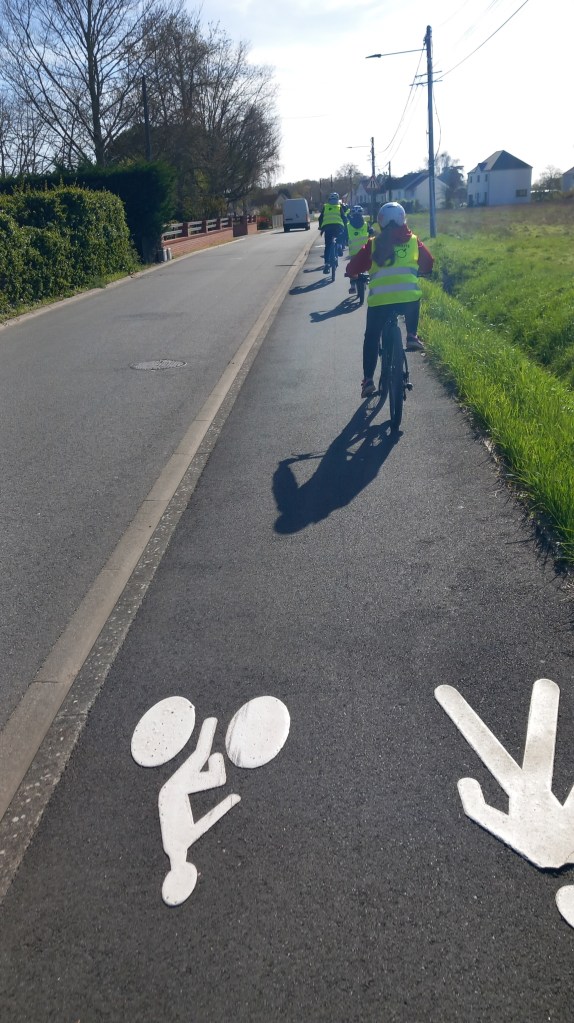Paradoxalement, c’est là que s’est produite la chute. La petite, serrant trop bien sa droite, a quitté la chaussée dans un moment d’inattention, un peu comme on tombe dans un rail de tram. Elle a perdu l’équilibre lorsque, par réflexe, elle a voulu remonter sur le macadam avec un angle insuffisant (on peut descendre avec n’importe quel angle, mais pour monter, il faut le bon). Ses poursuivantes ont géré le freinage d’urgence avec une collision minimale, mais elle s’est fait mal au genou en se cognant contre le cadre. Je ferme la marche et suis le premier « secouriste », l’enseignant arrive très vite, elle se relève, essuie ses larmes et remonte sur le biclou. Il nous reste quelques tours de pédalier à parcourir avant la pause sur la portion interdite aux véhicules motorisées. Les deux groupes se réunissent, c’est le moment d’une pause, mais aussi la fin de l’expérience dans la circulation générale.
