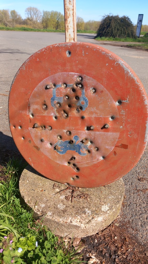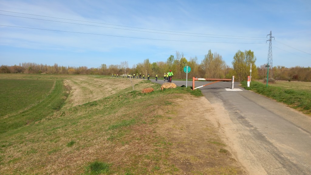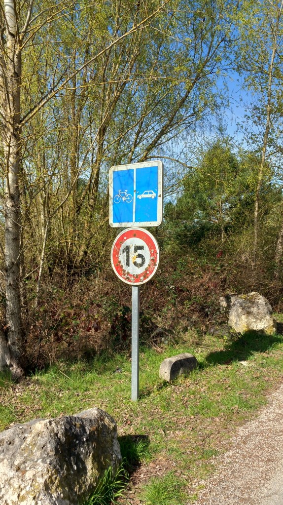 Nous roulons ensuite sur la levée. Sur cette portion, des véhicules peuvent circuler pour se rendre à un parking. Nous n’en croisons aucun, ce qui est plus agréable, mais nous fait louper l’expérience de se faire doubler par, ou de croiser, une voiture sur cette voie étroite, ce qui peut obliger à poser pied à terre et se positionner sur l’accotement.