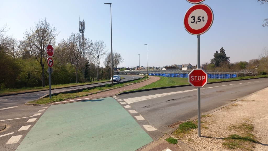 Nous voilà déjà arrivés au pied de la levée (une digue du bord de Loire), où un mini aménagement nous invite à un exercice assez technique : le cédez le passage en pente. Si un véhicule roule sur la levée, nous devrons nous arrêter avec une forte déclivité, ce qui ne sera pas simple.