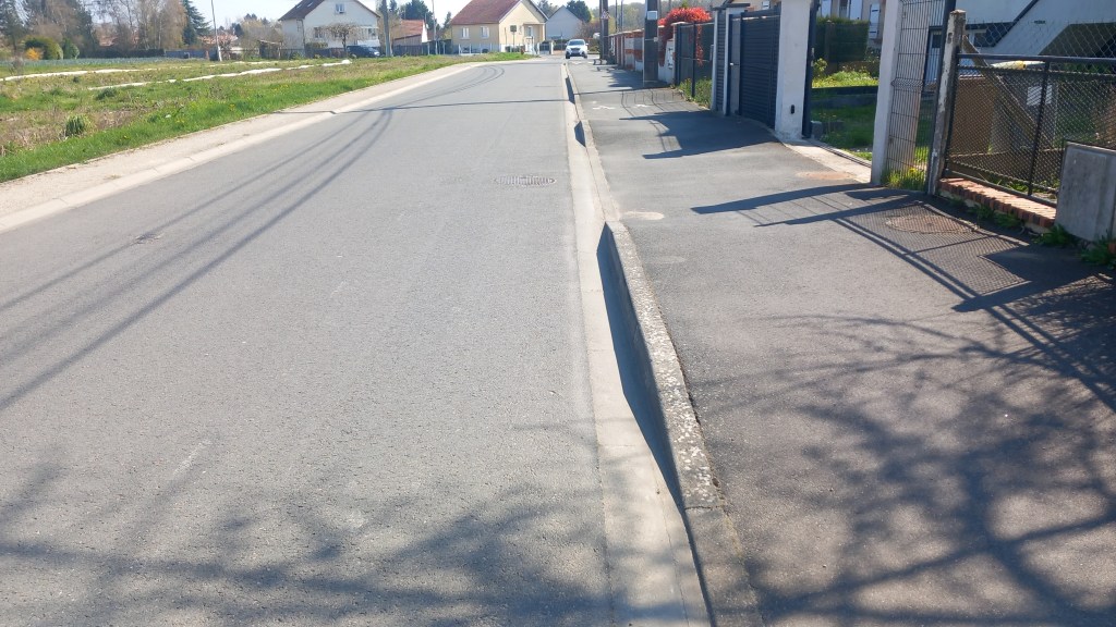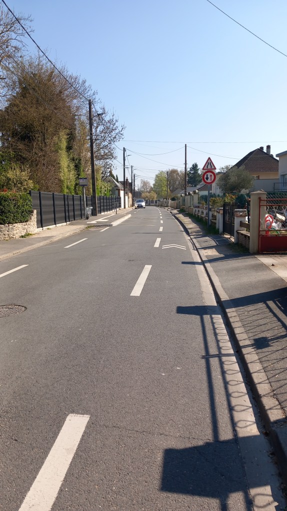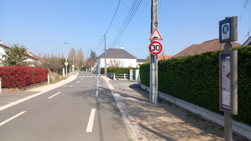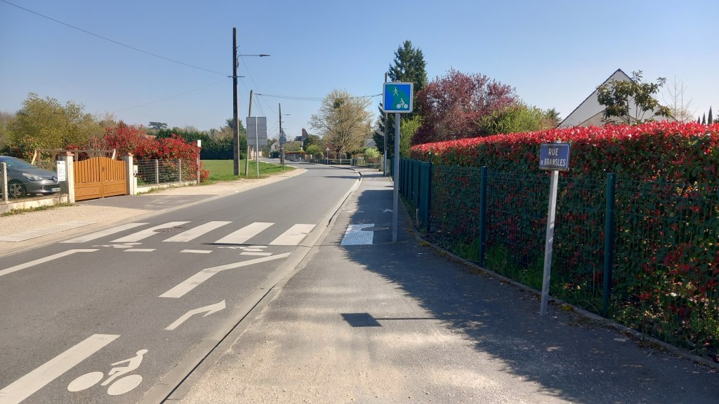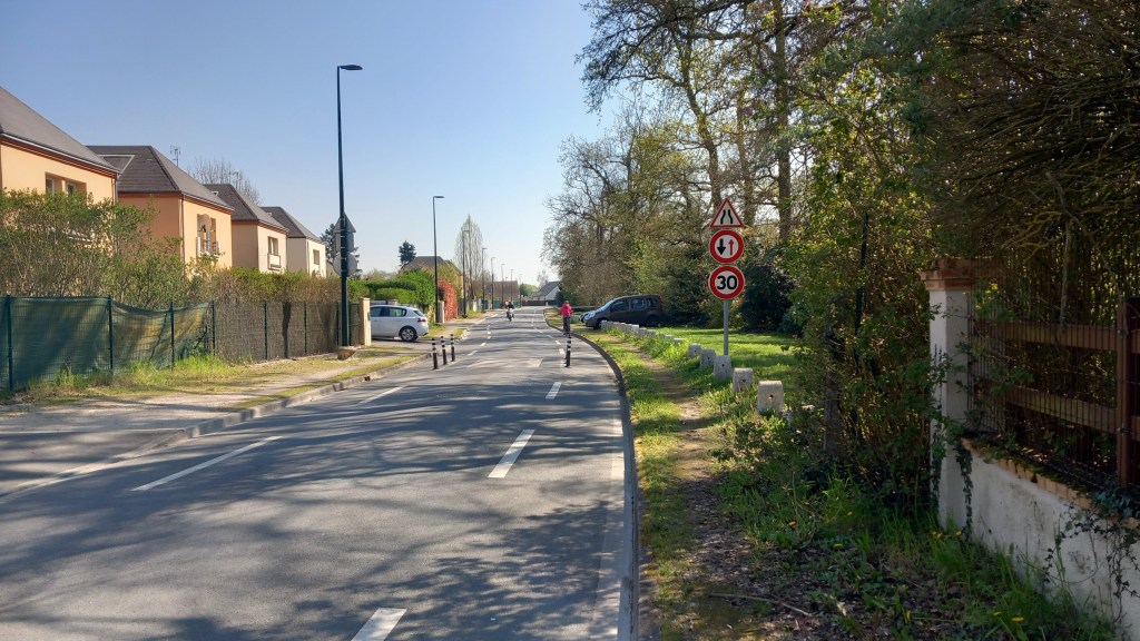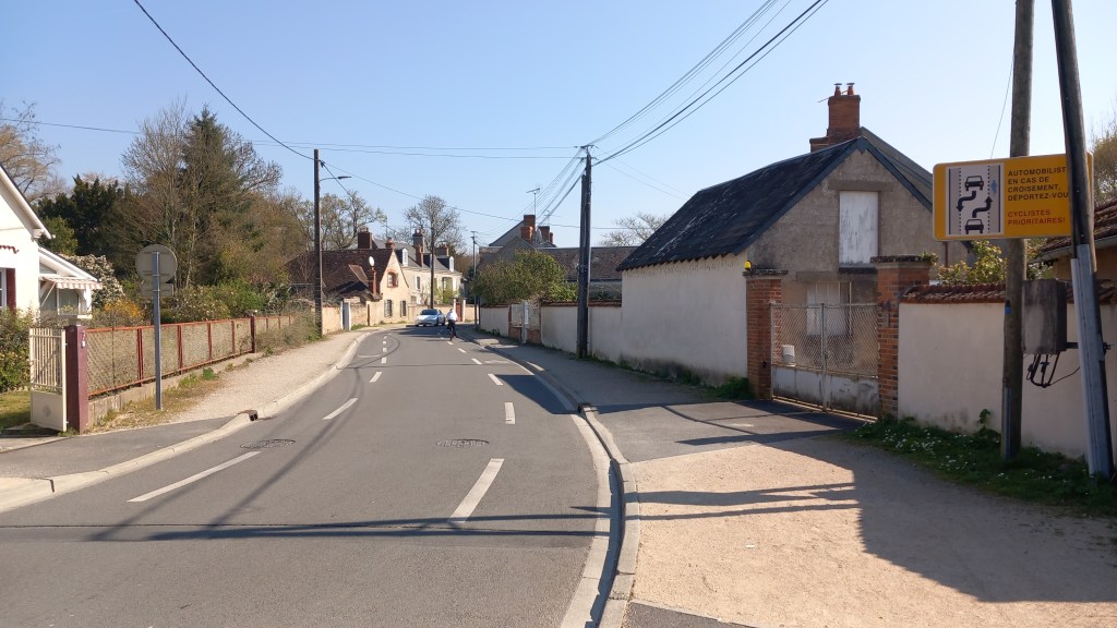 La rue débute par un rétrécissement sur lequel nous sommes prioritaires (l’obstacle est à gauche, c’est donc juste la règle qui s’applique). Aucun aménagement cyclable, pas de limitation de vitesse, nous sommes dans la vie dans la vraie, celle où nous cohabitons avec nos contemporains motorisés. Ici nous n’avons plus de traitement de faveur cyclable, d’emplacement dédié (pour le meilleur et pour le pire) nous sommes des usagers de la route comme les autres. Comme ça ne circule pas beaucoup, moins que sur l’axe Rosette/Bransles, on se sent en sécurité. Pas besoin d’aménagement dédié ici.