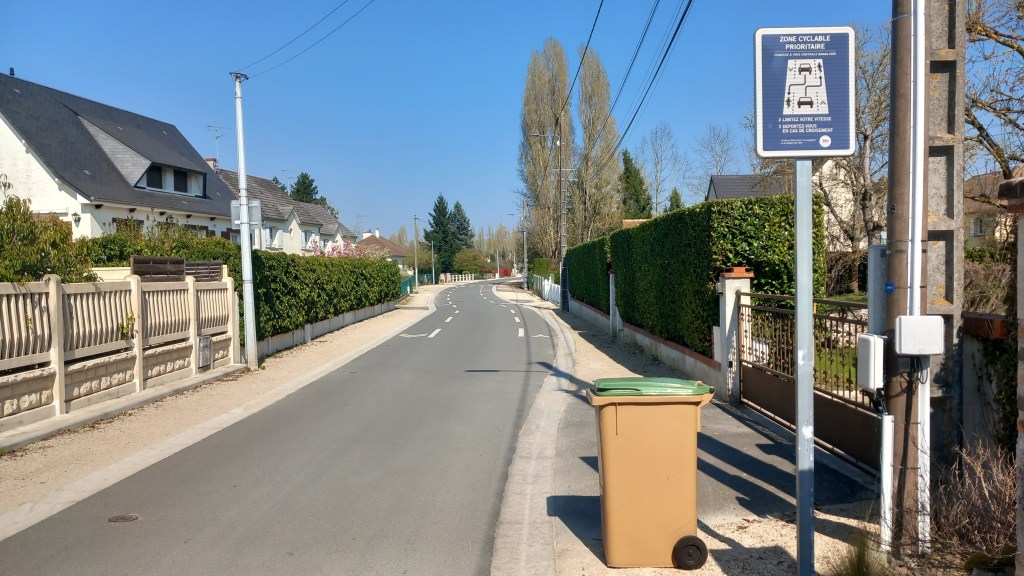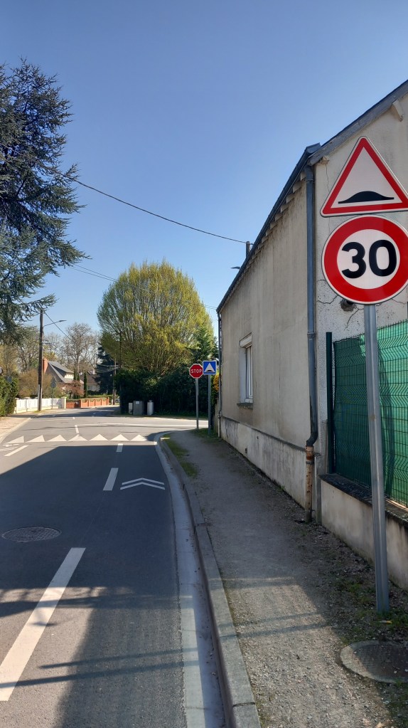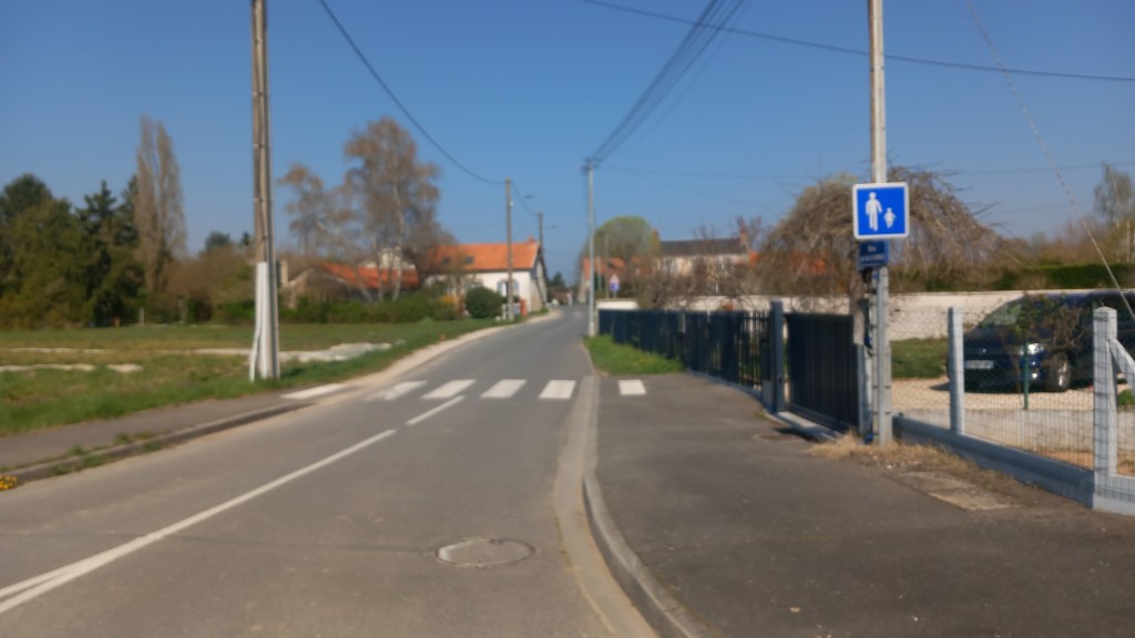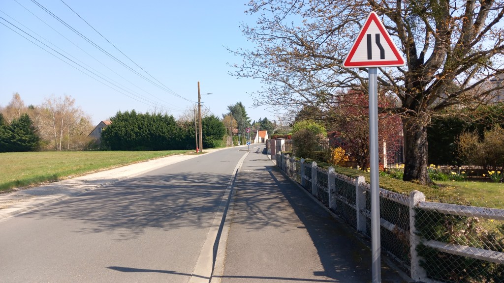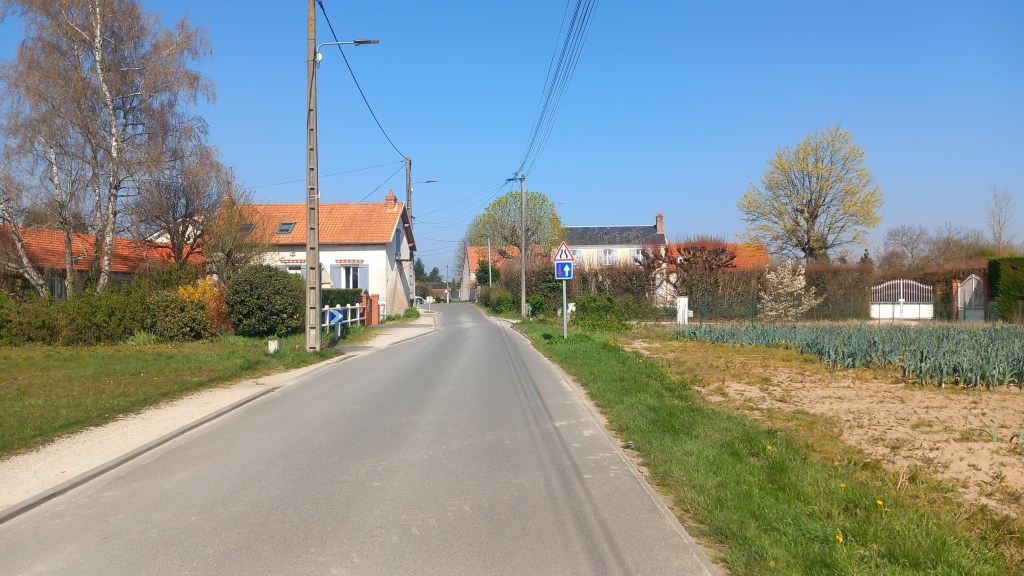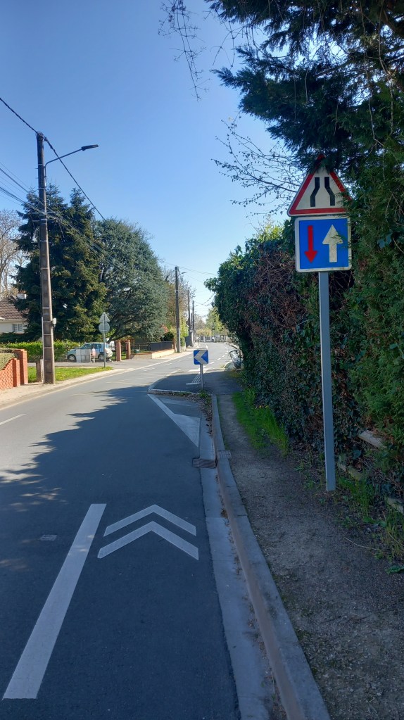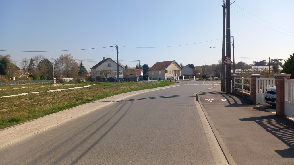 La rue débute par un rétrécissement sur lequel nous sommes prioritaires (l’obstacle est à gauche, c’est donc juste la règle qui s’applique). Aucun aménagement cyclable, pas de limitation de vitesse, nous sommes dans la vie dans la vraie, celle où nous cohabitons avec nos contemporains motorisés. Ici nous n’avons plus de traitement de faveur cyclable, d’emplacement dédié (pour le meilleur et pour le pire) nous sommes des usagers de la route comme les autres. Comme ça ne circule pas beaucoup, moins que sur l’axe Rosette/Bransles, on se sent en sécurité. Pas besoin d’aménagement dédié ici.