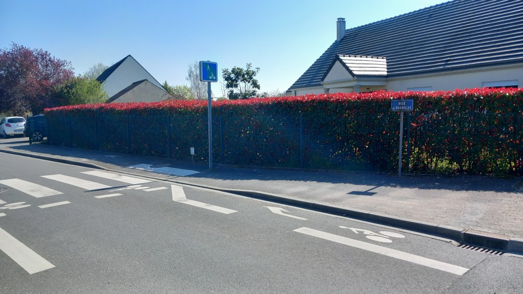 La rue de Bransles, comme la rue de Rosette, est bardées de rétrécissements et chicanes, mais la vitesse maximale autorisée reste 50. Ce qui est peut-être la raison pour laquelle on recommande exceptionnellement au vélo de rouler sur le trottoir (en contradiction avec la règle) en imaginant qu’il serait une voie verte (« Et si on disait que c’était une voie verte ? – Ah ouais, trop bien, comme ça on pourrait rouler dessus. »).