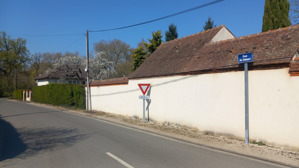 Nous voilà déjà à la bifurcation suivante qui mérite sa petite photo : à gauche rue du désert, à droite, rue de la boulaie. On ne va pas envoyer les mômes dans le désert !
